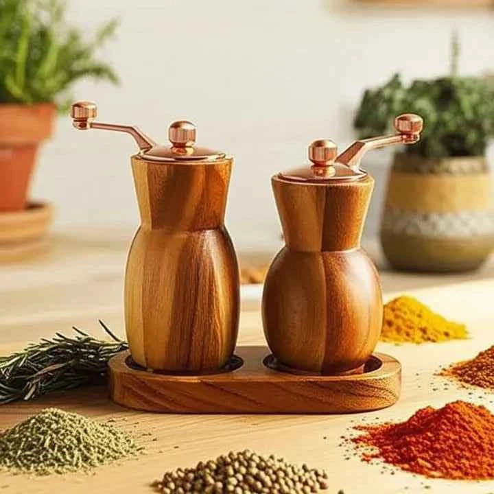 Cada peça do conjunto é uma obra de arte artesanal. Feitos em madeira nobre de alta qualidade, os moedores exibem veios e texturas únicas que contam uma história de cuidado e atenção. Adicione um toque de calor e autenticidade à decoração da sua mesa.